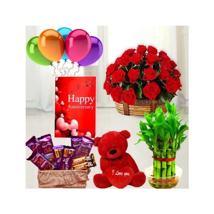 Basket of 15 red roses, Basket of 7 dairymilk silk, 2 Fivestar, 6 inch height teddybear , 2 layer Lucky bamboo plant ,5 blown balloons with anniversary greeting card