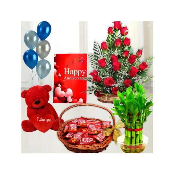 Anniversary is a special day to celebrate the love and bond of a couple. Let your dear ones know how much you love them with this special anniversary basket arrangement that comes with 20 red roses, a basket of 20 kit kat , a 6 inch height teddybear , a 2 layer Lucky bamboo plant and 5 blown balloons with an anniversary greeting card. This is a unique and beautiful way to express your feelings and make the day even more memorable.