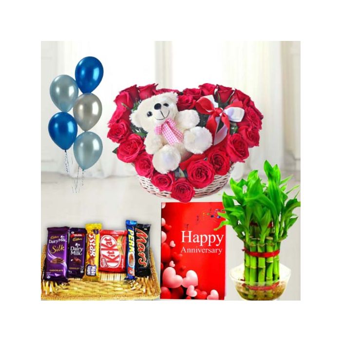 Basket arrangement of 20 red roses, basket of assorted chocolates, 6 inch height teddy bear, 2 layer Lucky bamboo plant, 5 blown balloons with anniversary greeting card