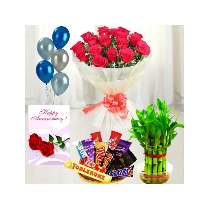 Bunch of 15 red roses, basket of assorted chocolates, 6 inch height teddybear , 2 layer Lucky bamboo plant ,5 blown balloons with anniversary greeting card