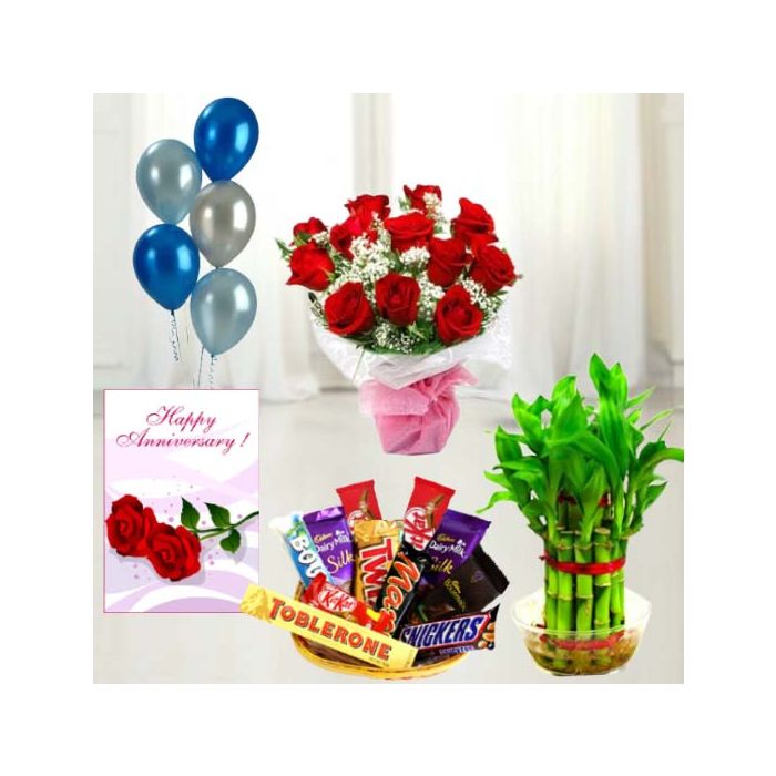 Bunch of 10 red roses, basket of assorted chocolates, 6 inch height teddybear , 2 layer Lucky bamboo plant ,5 blown balloons with anniversary greeting card