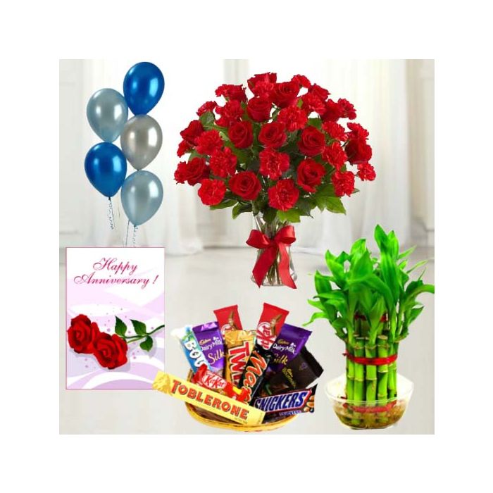 Beautiful vase arrangement of 20 red roses with carnations, basket of assorted chocolates, 6 inch height teddybear , 2 layer Lucky bamboo plant ,5 blown balloons with anniversary greeting card