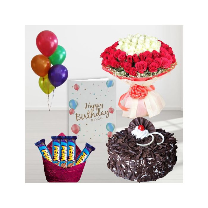 100 red and white roses, black forest cake, pack of 5 perk chocolates, birthday greeting card, with 5 blown balloons