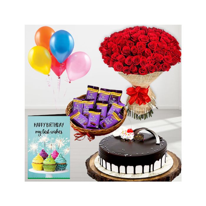 Looking for a complete birthday package that has everything you need? Look no further than this amazing bundle! It includes a beautiful bunch of 50 red roses, a scrumptious choco vanilla cake, and a basket of delicious dairy milk chocolates. Plus, there's a birthday greeting card and 5 blown balloons to really make the birthday celebration special. Everything you need to make someone's big day extra special, all in one place!