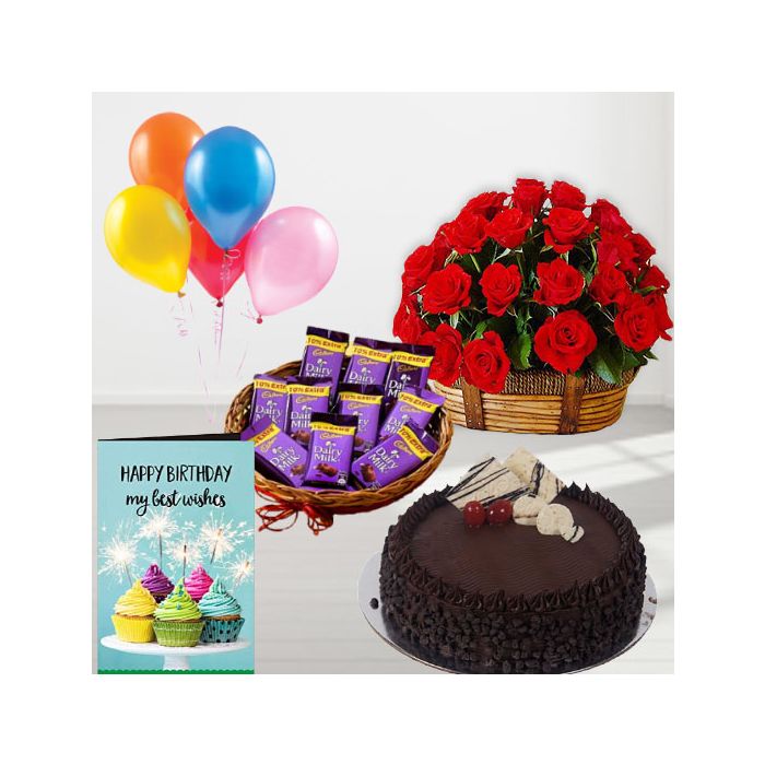 Looking for an amazing gift that will make someone's day? Look no further than our Basket of 15 red roses, choco chips premium quality cake, Basket of dairy milk chocolates, birthday Greeting card, with 5 blown balloons! This stunning gift basket is overflowing with gorgeous red roses, delicious choco chips cake, and creamy dairy milk chocolates - it's sure to make anyone's day extra special. Plus, the birthday greeting card and 5 blown balloons add an extra touch of fun and festivity. Whether you're sending this to a loved one, friend, or family member, they're sure to be thrilled with this incredible gift. Make someone's birthday extra special today - order our Basket of 15