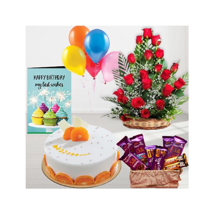 Looking for an amazing gift that is sure to please? Look no further than our Basket Arrangement of 20 red roses, orange cool cake, Basket of 7 dairy milk silk chocolates, with 2 Fivestar, birthday Greeting card, with 5 blown balloons. This thoughtful and beautiful gift is perfect for any occasion, and is sure to put a smile on the recipient's face.The basket arrangement includes 20 red roses that are arranged in a beautiful and eye-catching way. The orange cool cake is moist and delicious, and is sure to be a hit with everyone. The basket also includes 7 dairy milk silk chocolates that are perfect for a sweet treat. 2 Fivestar cand