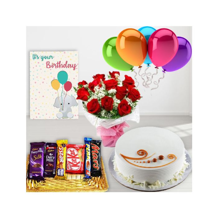 Bunch of 10 red roses , vanilla cool cake, basket of assorted chocolates, birthday Greeting card, with 5 blown balloons