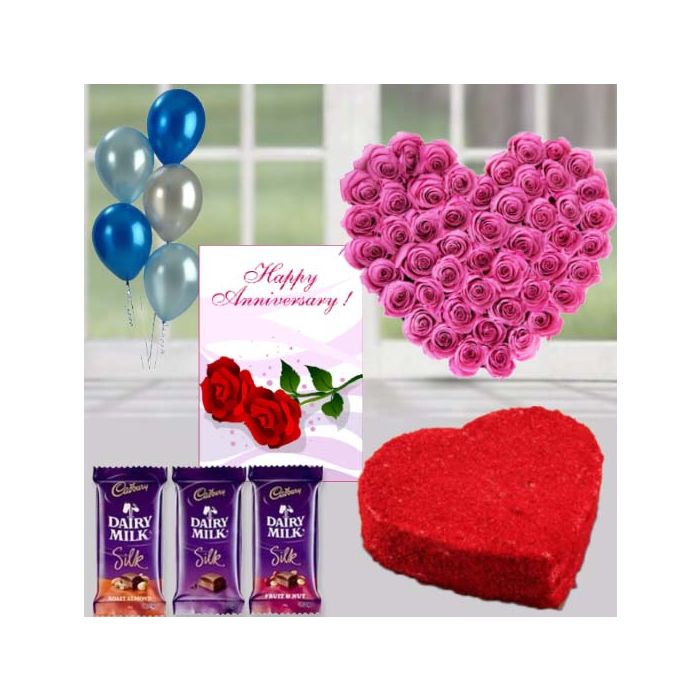 30 pink roses heart shape arrangement , heart shape red velvet cake, set of 3 dairy milk silk chocolates, anniversary greeting card, with 5 blown balloons