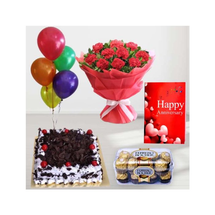 Celebrate your anniversary with this beautiful bunch of 20 red carnations, a delicious blackforest cake, and 16 divine Rocher Ferrero chocolates. It comes complete with a greeting card and 5 fun balloons to really make the day special. Your significant other is sure to love this thoughtful gift!