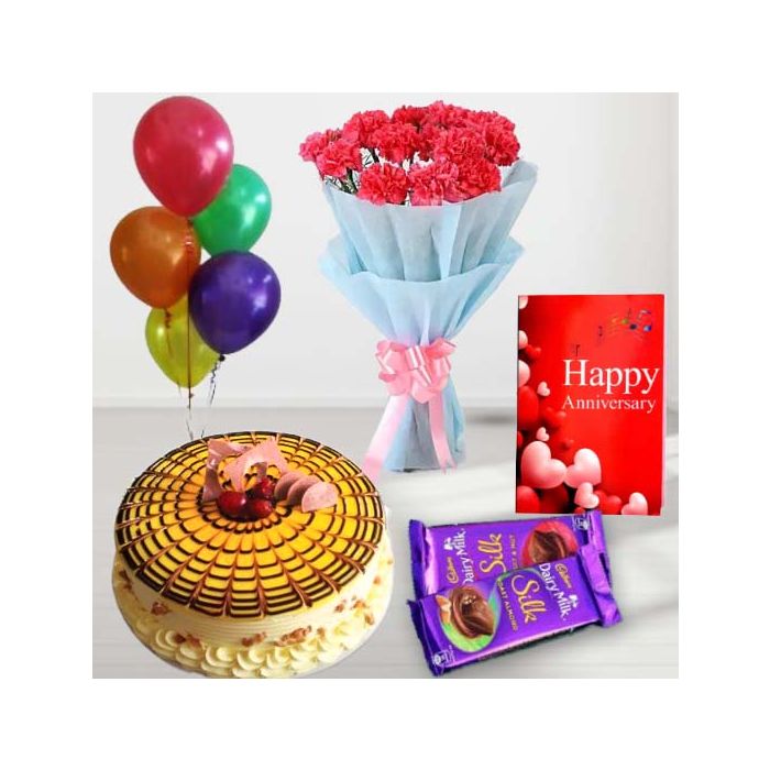 Looking for a unique and memorable way to celebrate your anniversary? Look no further than this gorgeous bunch of 10 pink carnations, premium quality butterscotch cool cake, and set of 2 dairy milk silk chocolates. This stunning arrangement is perfect for any anniversary, and comes complete with a beautiful greeting card and 5 balloons to really make the day special. The chocolates are a delicious treat that your loved one is sure to appreciate, and the flowers are a timeless symbol of love and affection. With this gift, you can be sure to make your anniversary one to remember!