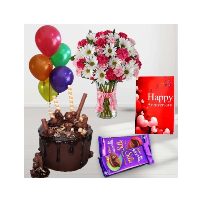 Make this anniversary extra special with our delicious chocolate explosion cake, set of 2 dairy milk silk, and vase arrangement of exotic mix flowers. Our anniversary greeting card and 5 blown balloons are sure to make this day even more memorable.