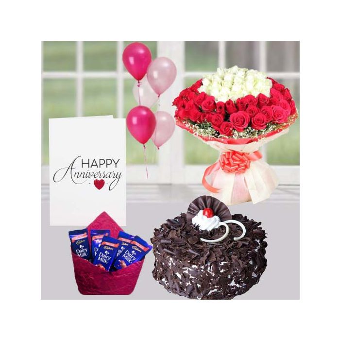 100 Red and White Roses, Black Forest Cake, Pack of 5 Perk Chocolates, Anniversary Greeting Card, with 5 Blown Balloons is the perfect way to show your loved one how much you care! These beautiful roses will last for weeks, and the delicious cake and chocolates are sure to satisfy any sweet tooth. Add in the festive greeting card and balloons, and this gift is sure to make any anniversary celebration complete!