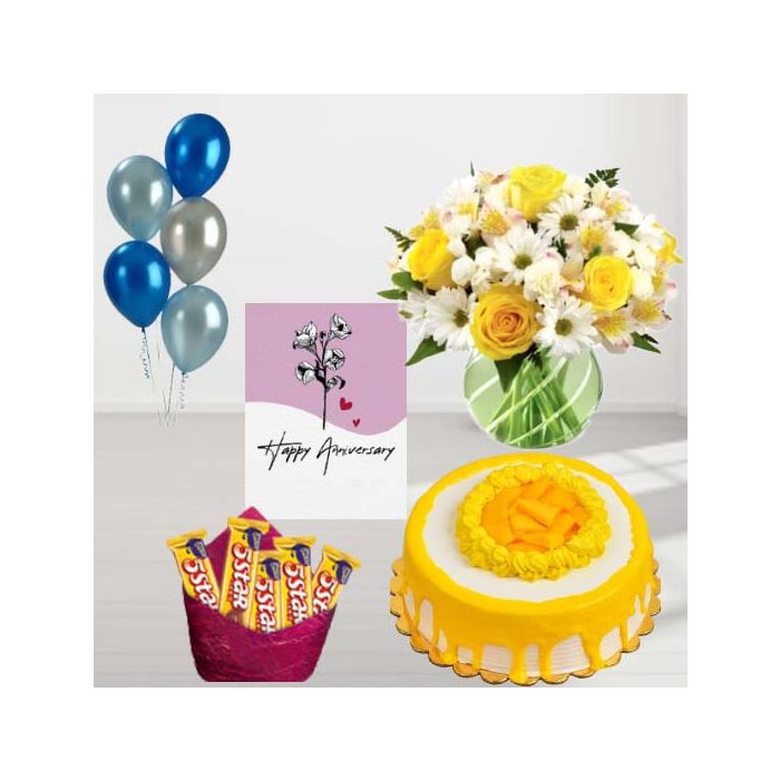 Looking for the perfect anniversary gift? Look no further than this vase arrangement of exotic mix flowers, mango cool cake, and a pack of 5 Fivestar chocolates. It comes with a greeting card and 5 blown balloons, making it a truly special present. The vibrant colors of the flowers and the deliciousness of the cake are sure to put a smile on your loved one's face. So go ahead and make this anniversary one to remember with this unforgettable gift!