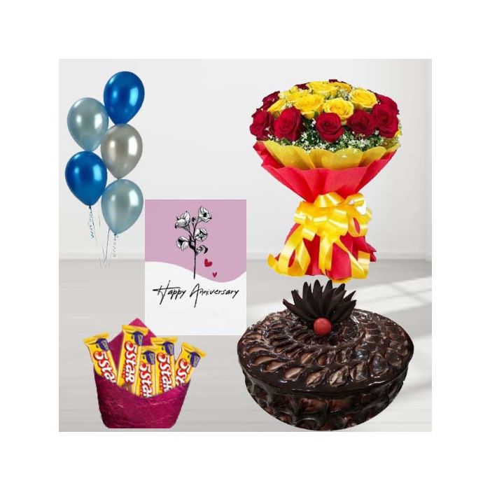 Celebrate your anniversary in style with this beautiful gift set! It includes a stunning bunch of 15 red and yellow roses, a delicious chocolate fudge cake, and a cute pack of 5 Fivestar chocolates. Plus, there's an anniversary greeting card and 5 blown balloons to really make the occasion special. Your loved one is sure to appreciate this thoughtful gift.