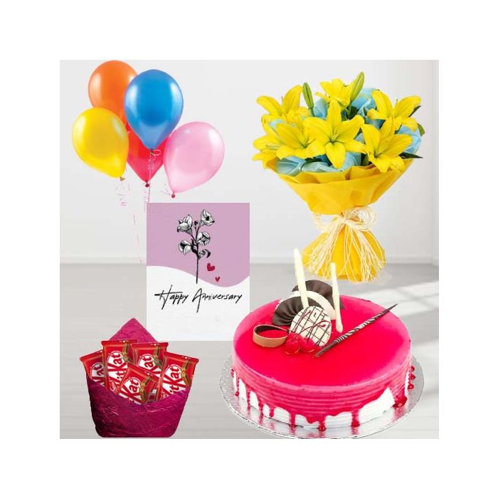 Welcome to our anniversary gift hamper! We've put together a selection of some of our most popular gifts, all designed to make your anniversary celebrations extra special.The centerpiece of our hamper is a beautiful bunch of 5 yellow asiatic lilies, which are perfect for showing your loved one how much you care. We've also included a delicious strawberry cool cake, which is perfect for sharing with friends or family. To complete the package, we've added a pack of 5 Kitkat chocolates and an anniversary greeting card. Plus, we've also included 5 blown balloons to really get the party started!