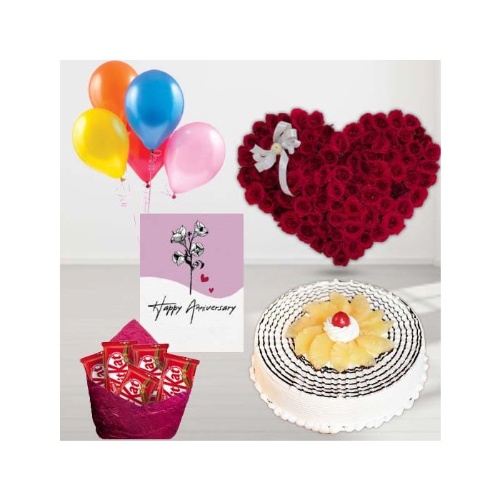 Looking for an unforgettable way to show your loved one how much you care? Look no further than our 50 red roses heart shape arrangement! This luxurious bouquet is overflowing with 50 premium red roses, arranged in a beautiful heart shape. It's the perfect way to say "I Love You" on any special occasion And what could be sweeter than our delicious pineapple premium quality cake? This delicious cake is made with fresh, juicy pineapple and rich cream cheese frosting. It's sure to please even the most discerning sweet tooth.To make this gift extra-special, we've also included a pack of 5 Kitkat chocolates, an anniversary greeting card, and 5 blown balloons. So whether you're celebrating
