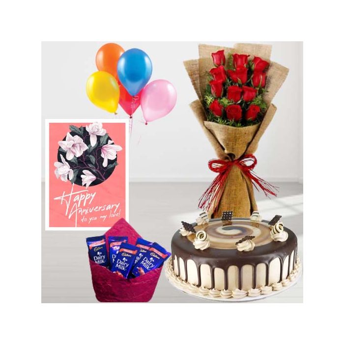 Bunch of 12 red roses with jute packing , Irish coffee cake, Pack of 5 dairy milk chocolates, anniversary greeting card, with 5 blown balloons