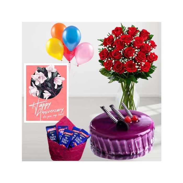 15 red roses in glass vase, black currant premium quality cake, Pack of 5 dairy milk chocolates, anniversary greeting card, with 5 blown balloons