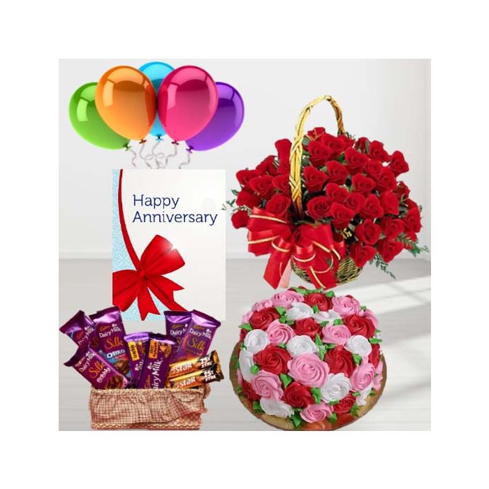 Looking for an amazing and romantic gift for your anniversary? Look no further than this gorgeous basket arrangement! It includes 30 red roses, a floral theme cake in vanilla flavor, a basket of 7 dairy milk silk chocolates, 2 Fivestar candies, an anniversary greeting card, and 5 blown balloons. This is sure to make your anniversary one to remember!