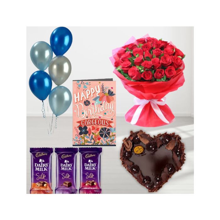 Bunch of 20 red roses , heart chocolate cake, set of 3 dairy milk silk chocolates, birthday greeting card, with 5 blown balloons