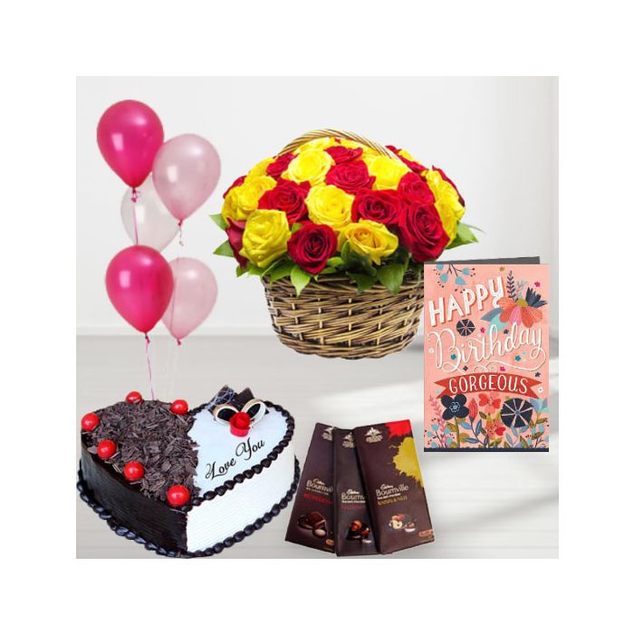 Basket of 15 red and yellow roses , premium quality black forest cake , set of 3 bournville chocolates, birthday greeting card, with 5 blown balloons