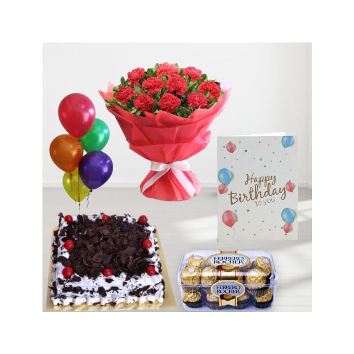 Is your loved one's birthday coming up? Then this is the perfect gift for them! This beautiful bunch of 20 red carnations, blackforest cake, 16 pcs rocher ferrero chocolates, birthday greeting card, with 5 blown balloons is sure to make their day special. They will absolutely love this stunning gift!