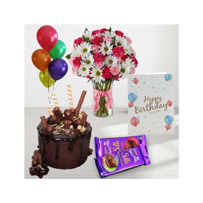 A vase arrangement of exotic mix flowers, chocolate explosion cake, set of 2 dairy milk silk, birthday greeting card, and 5 blown balloons is the perfect way to celebrate someone's birthday! The vase arrangement is full of beautiful and vibrant flowers that are sure to brighten up any room, and the chocolate explosion cake is sure to satisfy their sweet tooth. The set of 2 dairy milk silk is the perfect drink to accompany the cake, and the birthday greeting card is a lovely way to send your best wishes. This gift is sure to make their birthday truly special!
