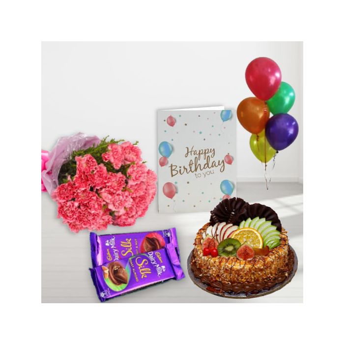 Welcome to our special birthday bundle! This fantastic bundle includes a beautiful bunch of 10 pink carnations, a delicious butterscotch fruit cake, and a set of 2 Dairy Milk Silk chocolates. It also comes with a birthday greeting card and 5 blown balloons, making it the perfect present for your loved ones.The pink carnations are a symbol of love and appreciation, making them the perfect way to show how much you care on this special day. The butterscotch fruit cake is moist and fluffy, and is sure to be a hit with everyone. The set of 2 Dairy Milk Silk chocolates are the perfect treat for anyone with a sweet tooth. And the birthday greeting card will add a personal