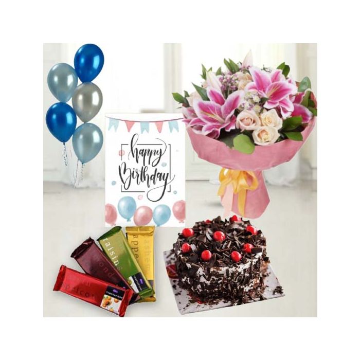 Welcome to our online store! We are excited to offer this gorgeous bunch of exotic mix flowers, black forest cake, and 4 temptations chocolates. This stunning bouquet is perfect for any special occasion, including birthdays, anniversaries, or just because! The vibrant colors and beautiful fragrance of the flowers are sure to delight anyone who receives them, and the delicious chocolate cake will make their day even sweeter! We have also included a birthday greeting card and 5 blown balloons to complete this wonderful gift. Order now and make someone’s day!