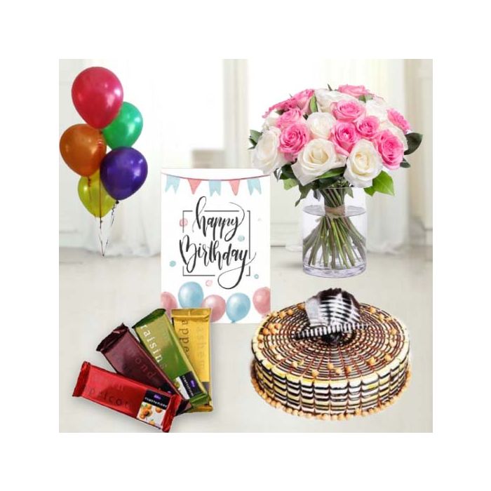 Vase arrangement of 20 pink and white roses, premium quality butterscotch cake, pack of 4 temptations chocolates , birthday greeting card, with 5 blown balloons