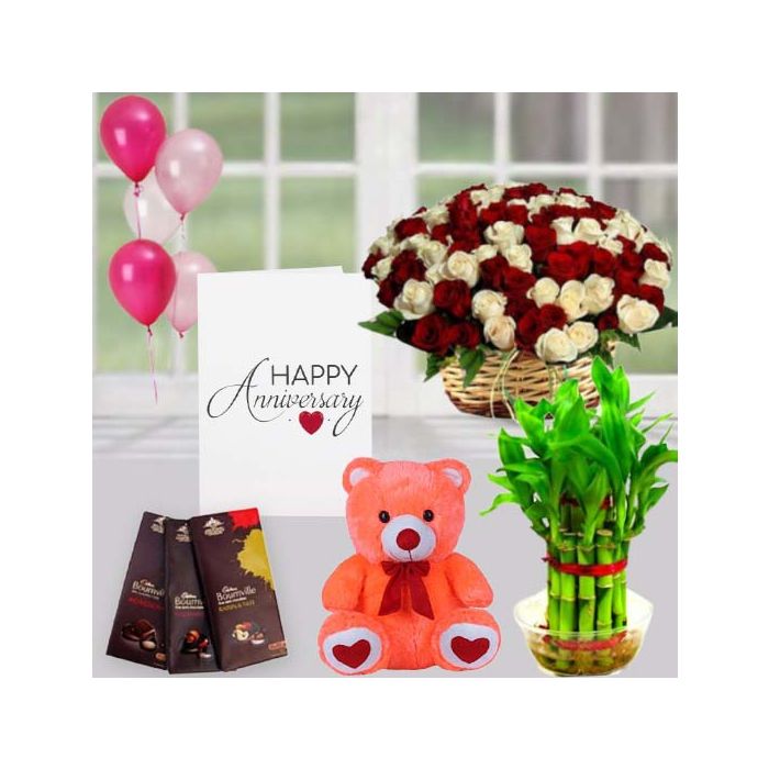 50 red and white roses basket , 6 inch teddybear, set of 3 bournville chocolates, 2 layer Lucky bamboo plant ,5 blown balloons with anniversary greeting card