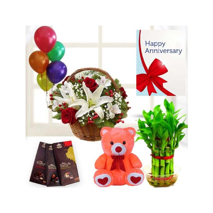 Basket of 15 red and yellow roses, 1 feet height teddy bear, set of 3 bournville chocolates, 2 layer Lucky bamboo plant, 5 blown balloons with anniversary greeting card