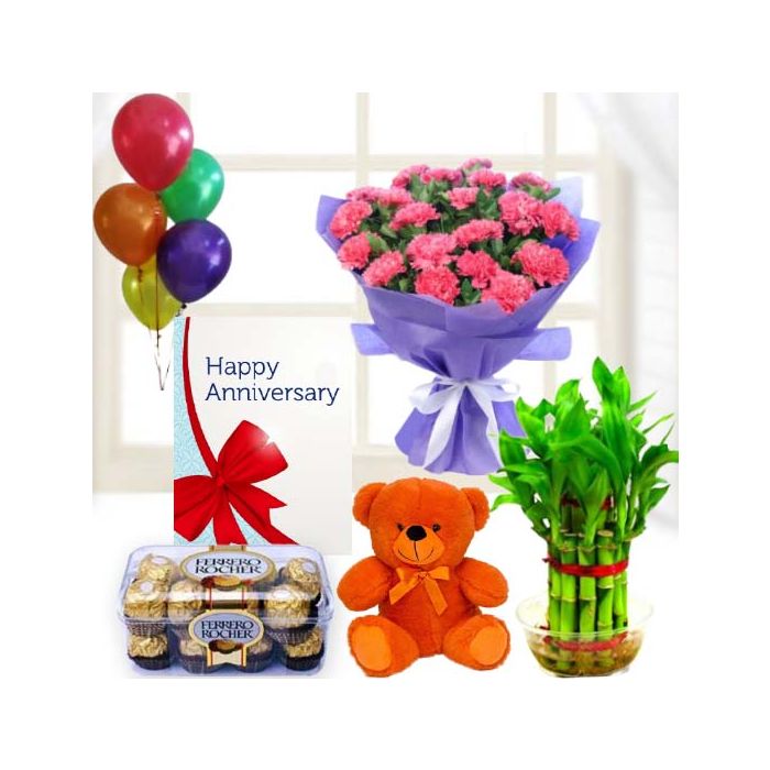 Bunch of 8 pink carnations, 6 inch teddybear, 16 pcs rocher ferrero chocolates, 2 layer Lucky bamboo plant ,5 blown balloons with anniversary greeting card