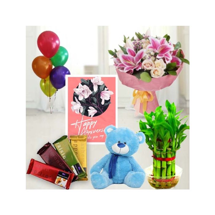 Bunch of 15 mix flowers, set of 4 bournville chocolates, 6 inch height teddybear , 2 layer Lucky bamboo plant ,5 blown balloons with anniversary greeting card
