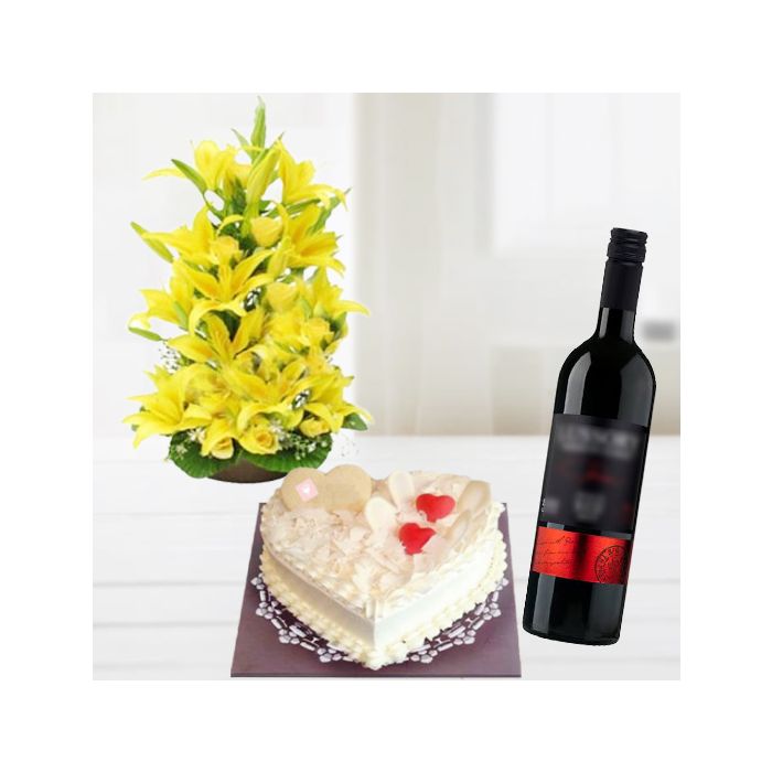 exotic arrangement of asiatic lilies with 2 feet height with vanilla heart shape cake with bottle of red wine