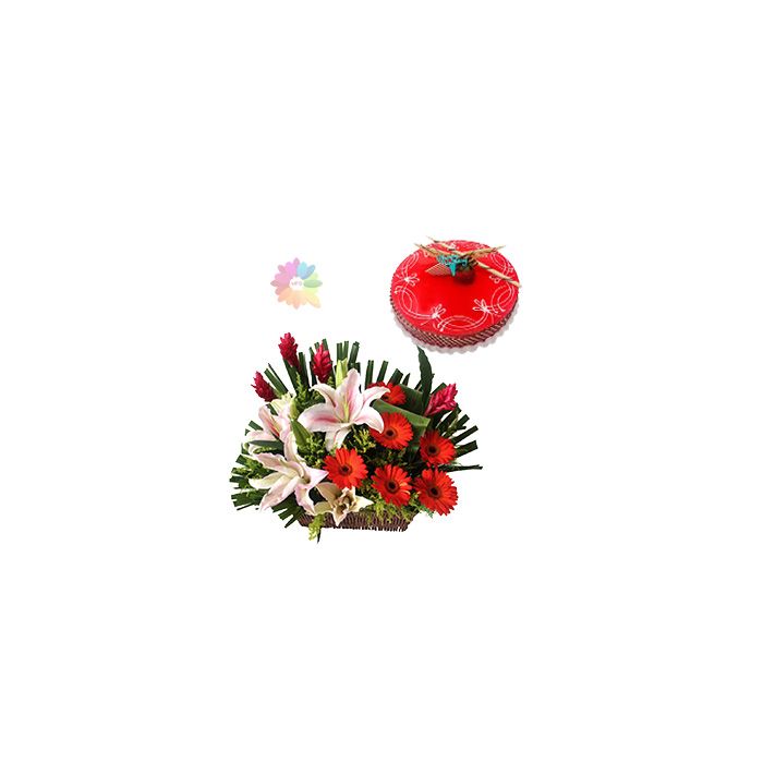 Welcome to our online store! We are excited to offer our customers this exotic basket arrangement of lilies and gerberas with half kg strawberry cake. This beautiful arrangement is perfect for any occasion, whether you are celebrating a birthday, anniversary, or just want to show your loved ones how much you care.The lilies and gerberas are arranged in a stylish basket, and the cake is covered in delicious strawberry frosting. We know that this arrangement will brighten anyone's day, so order now and enjoy free shipping on orders over $100.