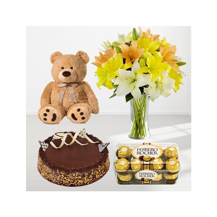 Exotic vase arrangement of 10 yellow and white lilies with 1 feet height brown teddybear, chocolate walnut cake with 16 pcs rocher ferrero chocolates 5500
