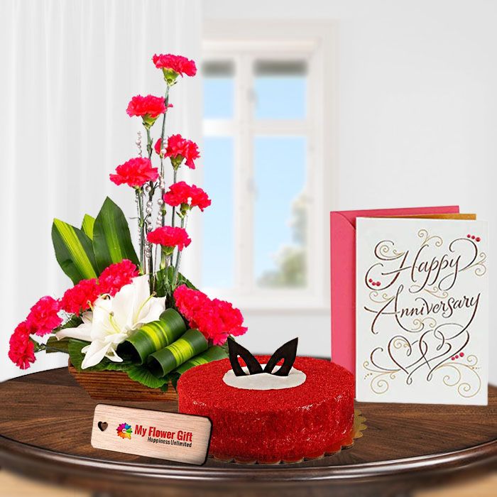 Celebrate your anniversary in style with this gorgeous basket arrangement of red carnations and white lilies, accompanied by a delicious half kilo red velvet cake. The perfect way to express your love and affection for your partner, this beautiful gift will make lasting memories. The red carnations and white lilies symbolize passion and purity respectively, making this arrangement even more special. The red velvet cake is rich, moist and simply irresistible - the perfect treat for celebrating your anniversary in a sweet way! So go ahead and indulge in some deliciousness while expressing your eternal love - order this anniversary combo now!