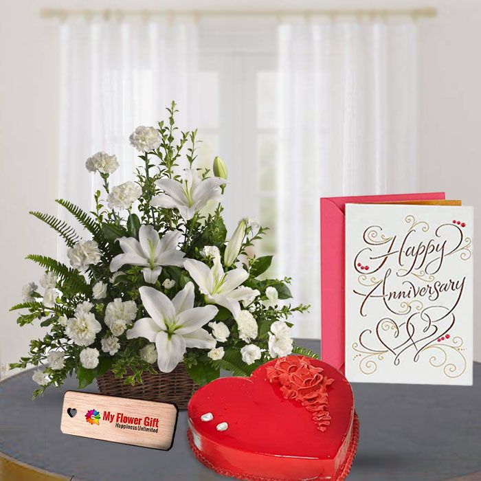 Exotic Basket arrangement of white flowers with 1 kg red velvet cake with anniversary card