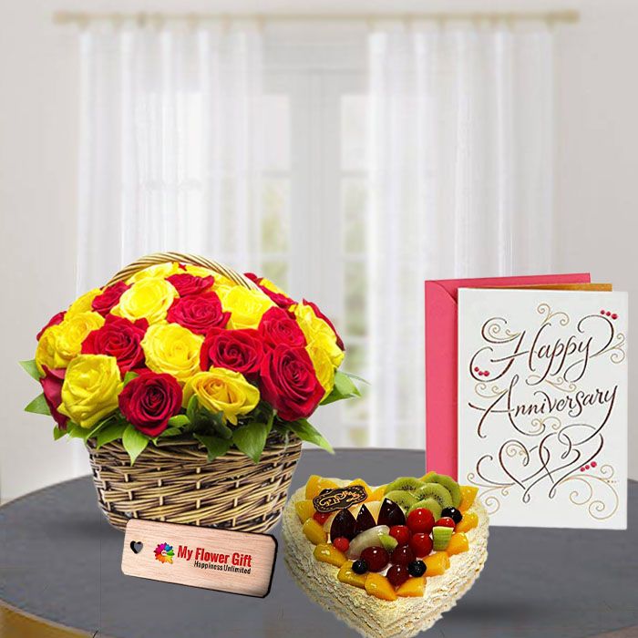 Looking for the perfect anniversary present? Look no further than this stunning 20 red and yellow roses basket arrangement with 1 kg heart shape mix fruit cake. It's the perfect way to show your loved one how much you care, and with the addition of an anniversary card, it's sure to make this a day they'll never forget. Order now and make this anniversary one to remember.