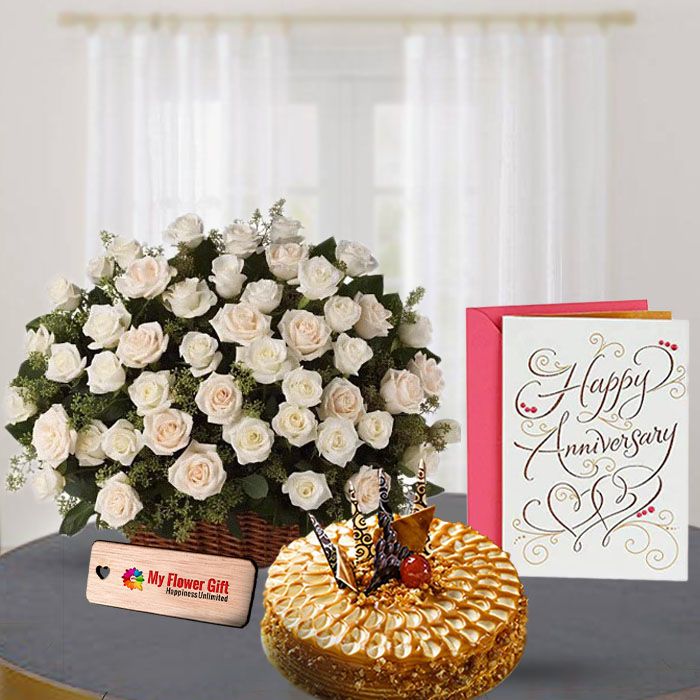 Basket of 30 white roses with half kg butterscotch premium quality cake with anniversary card