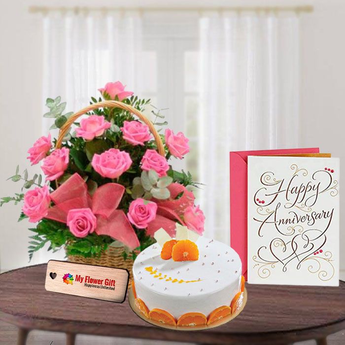Celebrate your anniversary in style with this stunning basket arrangement of 10 pink roses and a delicious half kg orange cake. The perfect way to show your loved one how much you care, this gift also comes with a beautiful anniversary card.