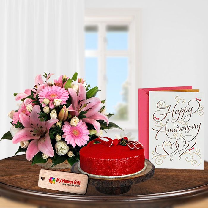 Exotic mix flowers with half kg red velvet cake with anniversary greeting card