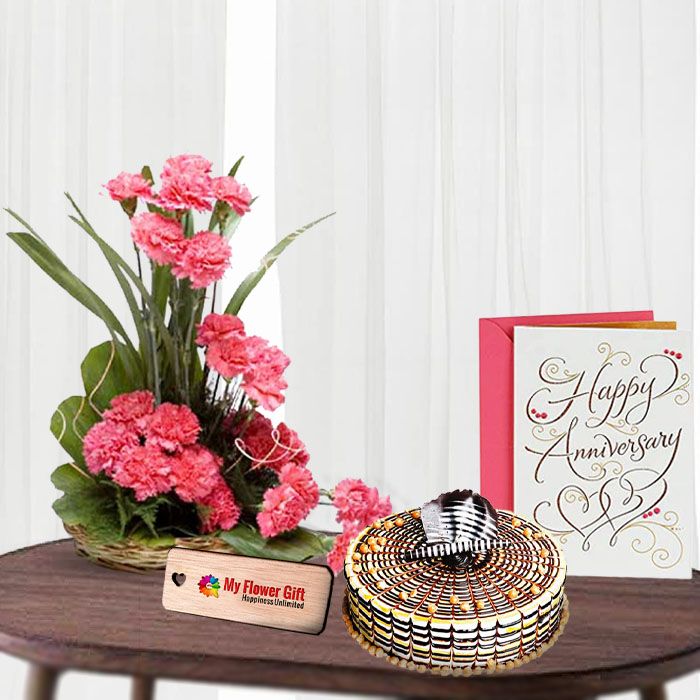 Looking for something special to celebrate your anniversary? Check out our basket arrangement of 20 pink carnations, half kg butterscotch cake, and anniversary card. This beautiful arrangement is sure to impress your loved one and make this anniversary one to remember. The perfect way to say "I love you" on this special day.