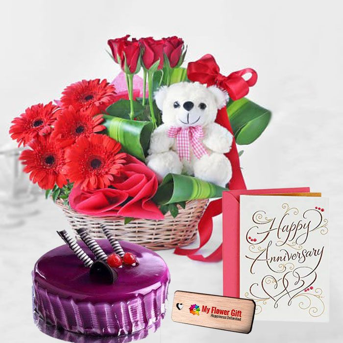 Celebrate your anniversary in style with this beautiful basket arrangement of red gerberas and a cute teddy bear sitting in it. The arrangement is completed with a half kg black currant cake, making it the perfect gift for your loved one.