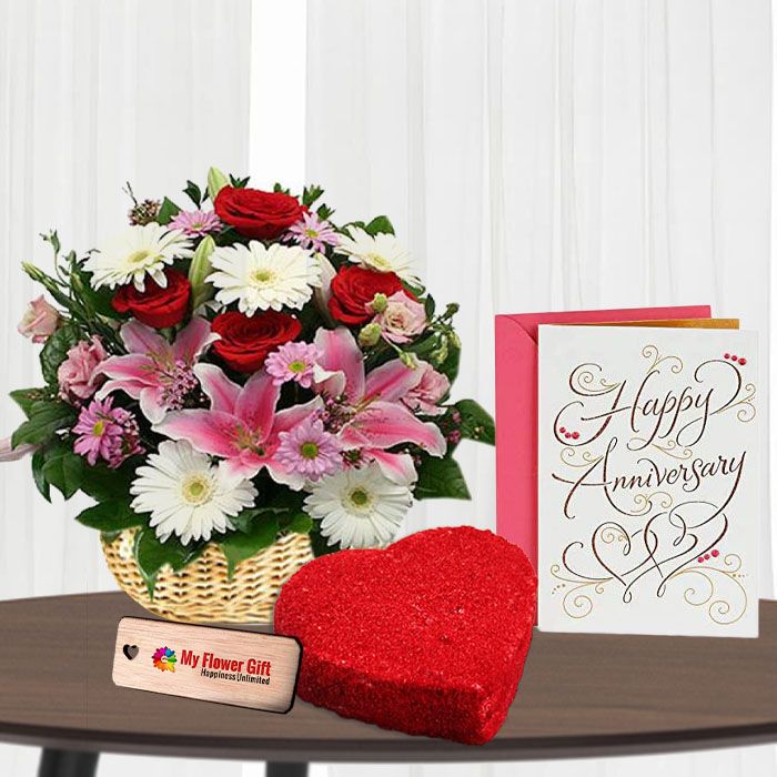 Beautiful mix flowers basket arrangement with1 kg heart shape red velvet cake with anniversary card