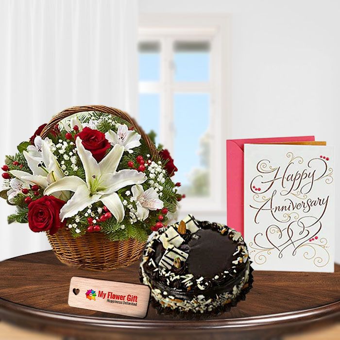 Looking for the perfect anniversary gift? Look no further than this stunning basket arrangement of fresh red roses and exotic white lilies. This beautiful arrangement is teamed with a delicious half kg chocolate almond cake, making it a truly special gift. The perfect way to show your loved one how much you care.