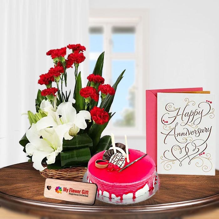What could be more romantic than a basket of red carnations and white lilies? This arrangement is the perfect way to show your loved one how much you care on your anniversary. Plus, it comes with a delicious half kg strawberry cake to make the celebration even sweeter. So don't wait, order this special package today!