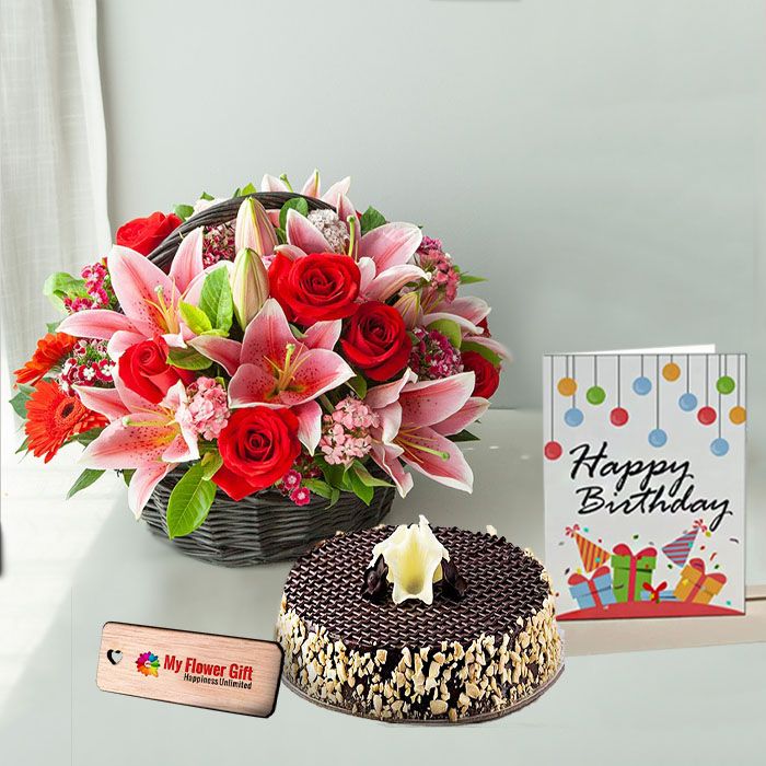 Basket Arrangement of mix exotic flowers with half kg chocolate almond cake with birthday card