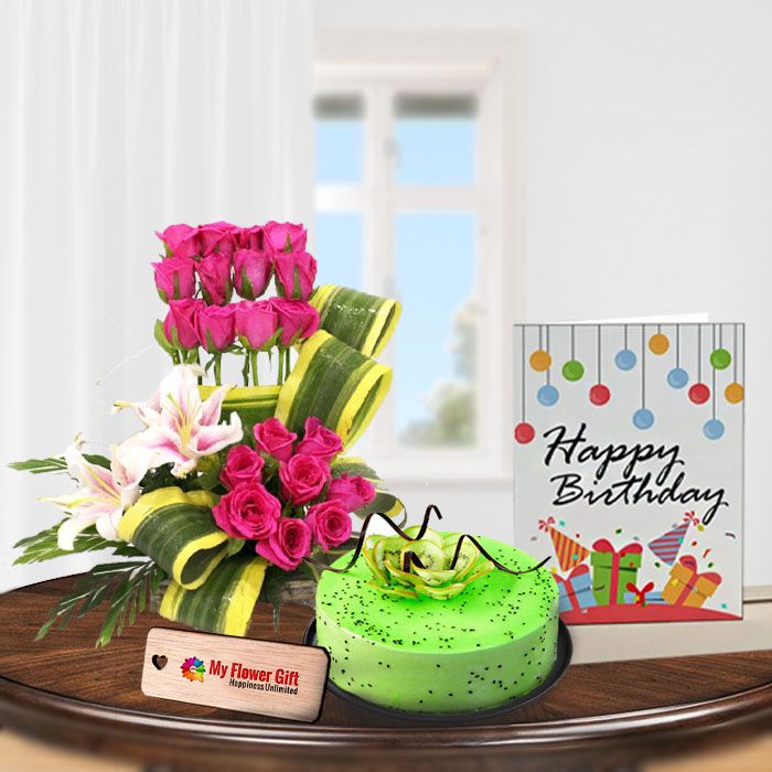 Basket arrangement of roses and lilies with half kg kiwi cake and a birthday card